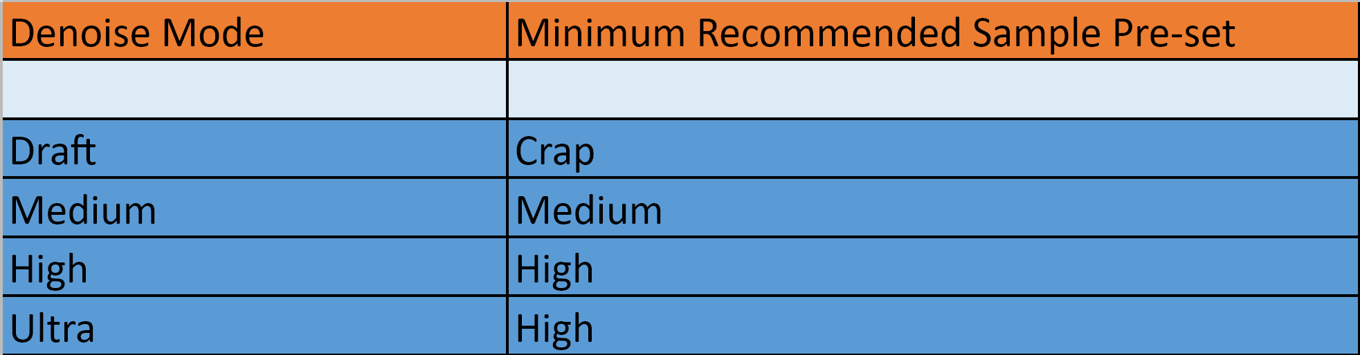 Recommended minimum sample presets to use for each denoise mode: