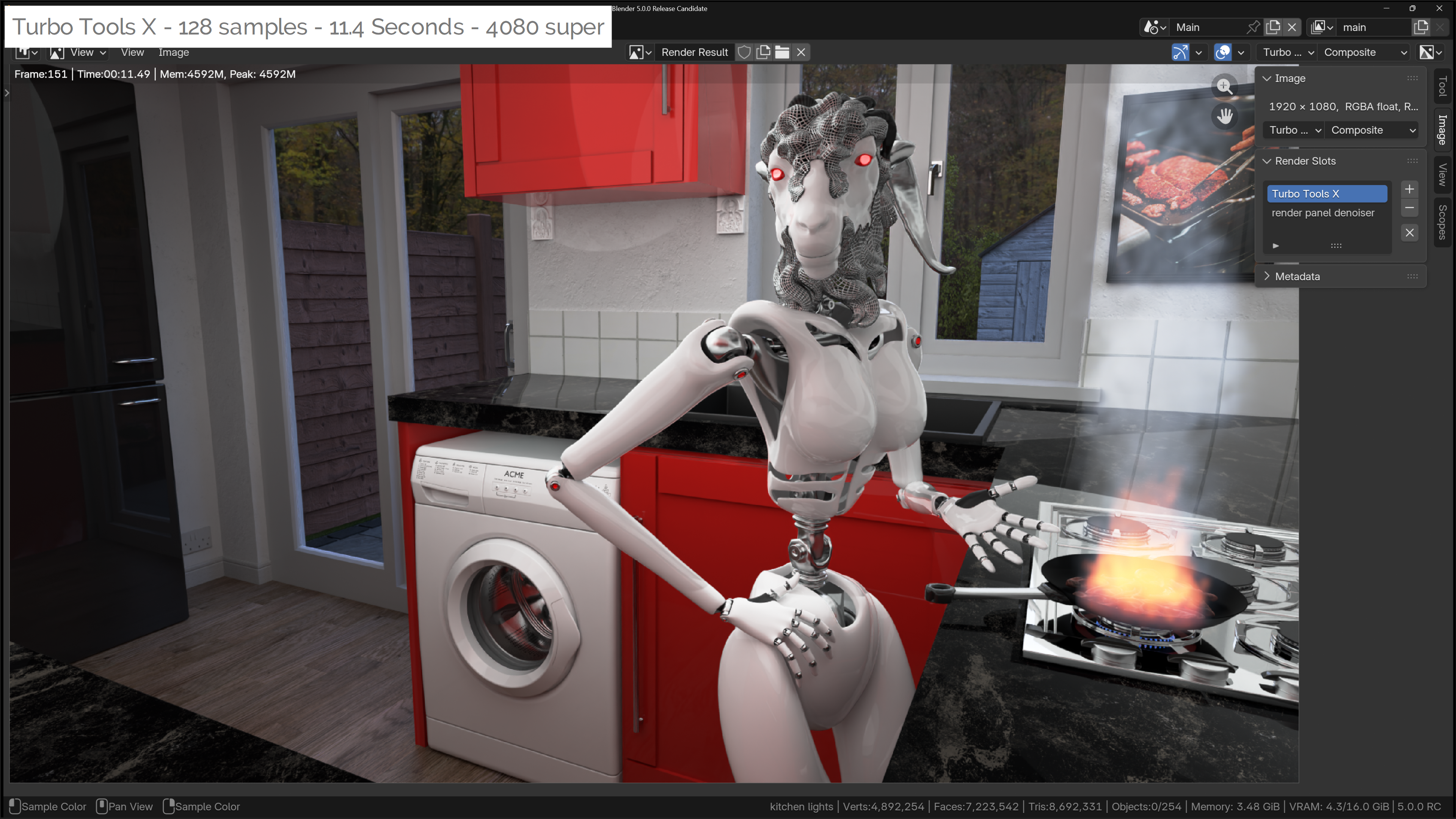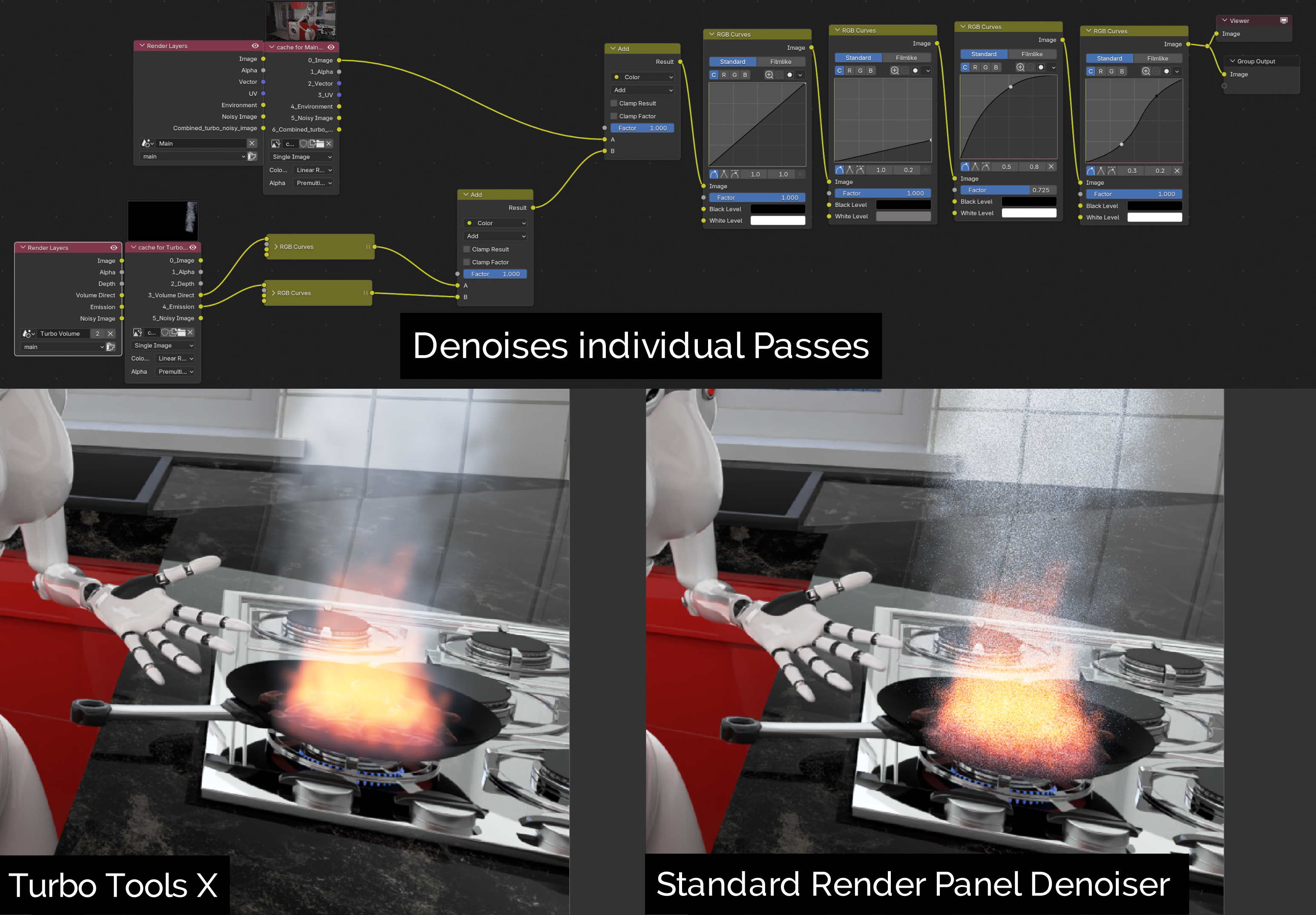 - Turbo Render - Automates complex render setup and implements professional rendering techniques, using a small number of artist friendly options. It also builds advanced denoising networks that allow fewer samples to be used for faster renders that retain more details than standard denoisers.
