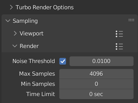 - IMPORTANT - Use the lowest sample pre-set possible without introducing loss of detail. You can find the optimum setting by quickly rendering a small render region of the noisiest area of the render. Repeatedly render and reduce the samples until you find the lowest number of sample that don't negatively impact image quality, the turn off the render region before rendering properly. If you want more control, the 'User' sample pre-set mode, will allow you to optimise noise threshold, min and max samples.