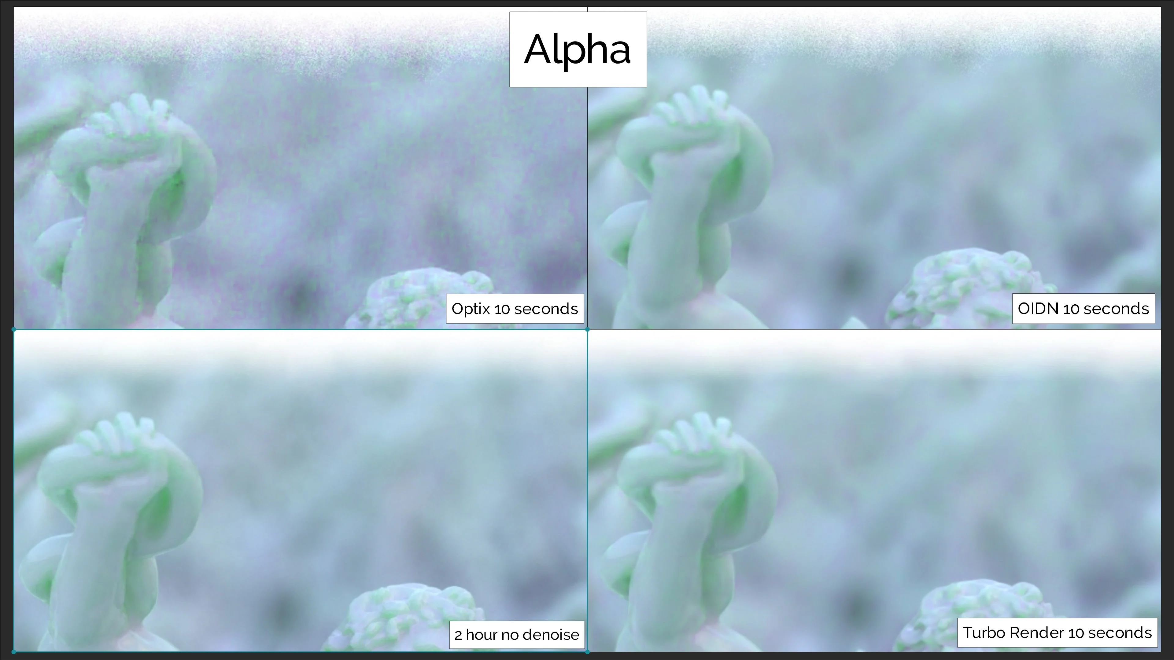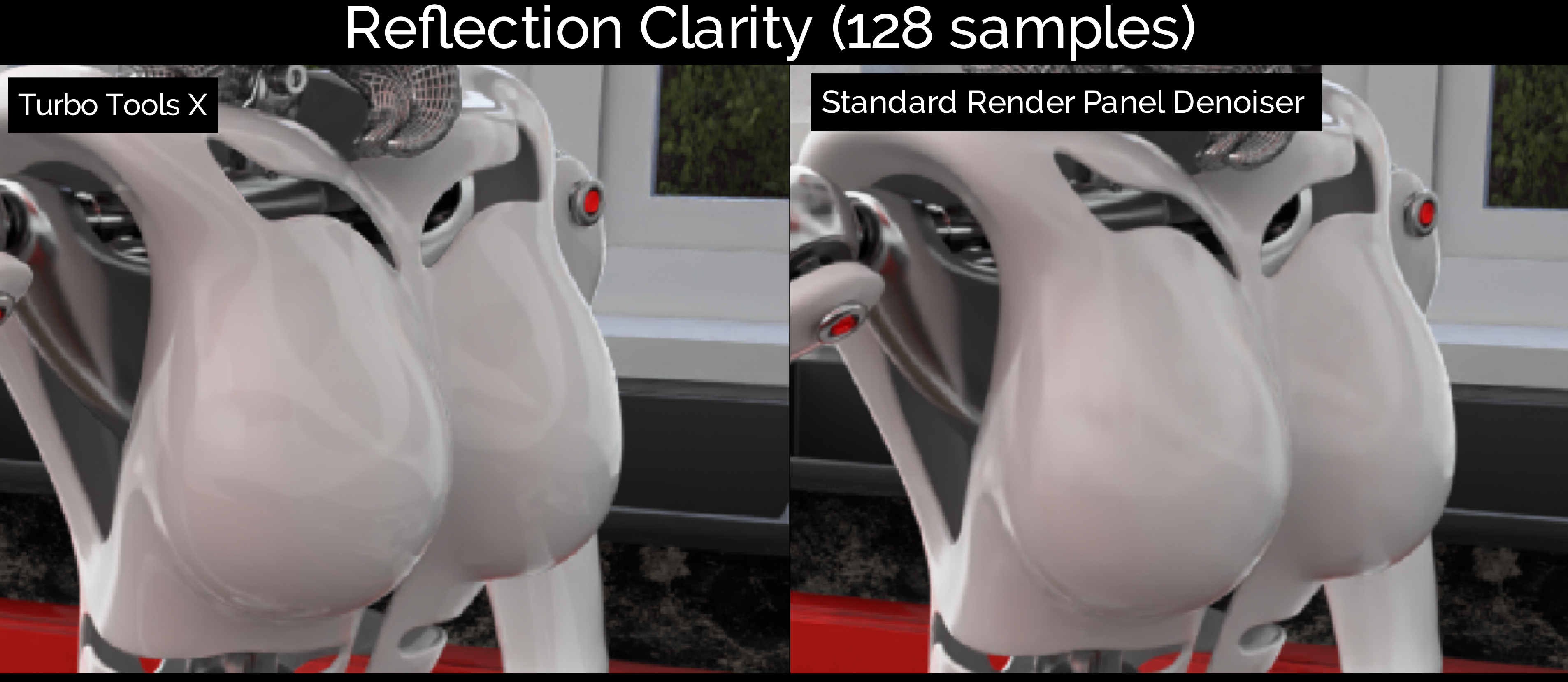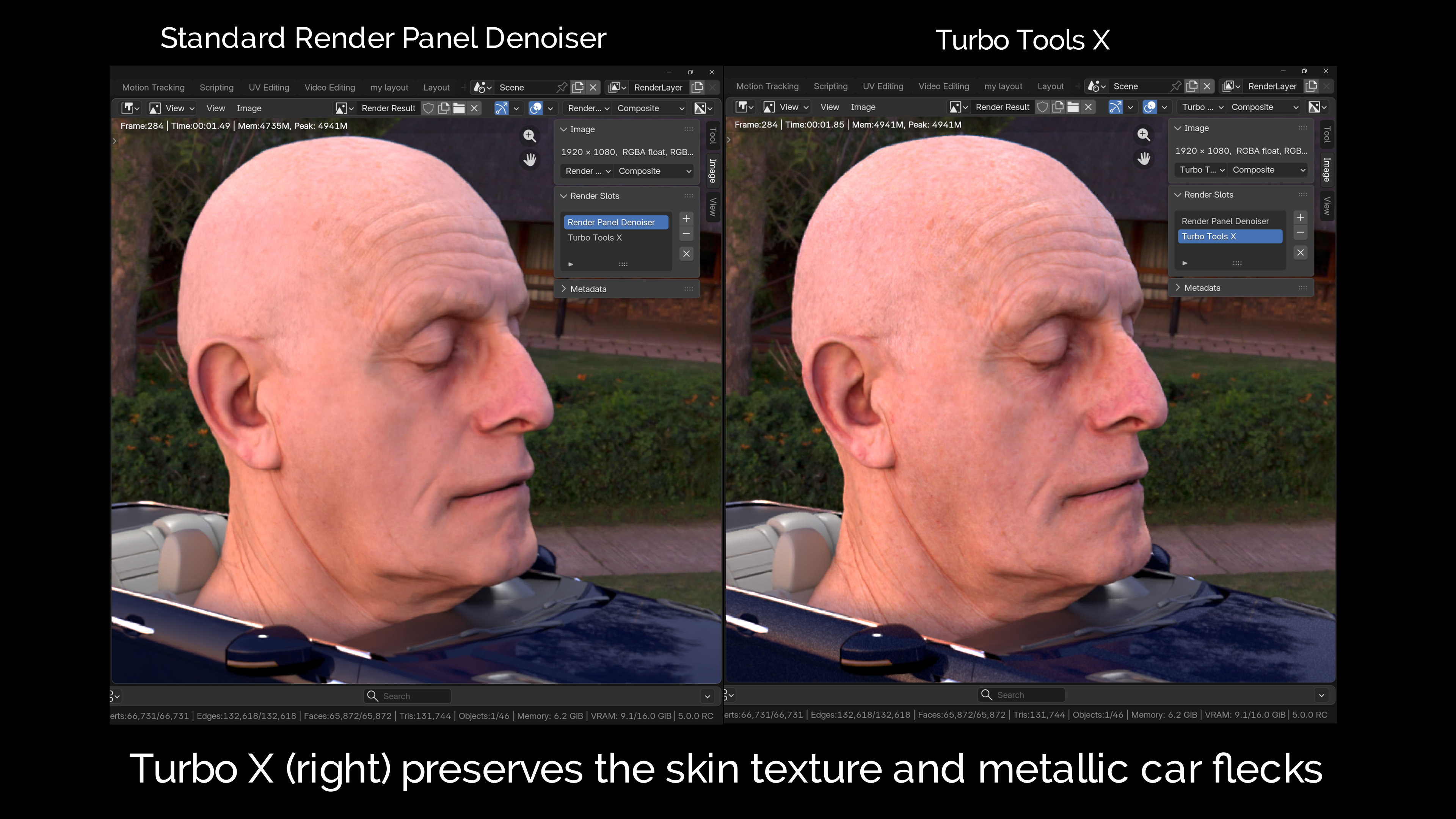- Even at very low samples, Turbo Render can retain fine texture details that are lost by other denoisers. The fine skin details and metallic paint flecks below, are a great example. Even when the standard denoiser is fed an image that's rendered for twice as long, the fine details are still lost, as can be seen with this interactive slider!