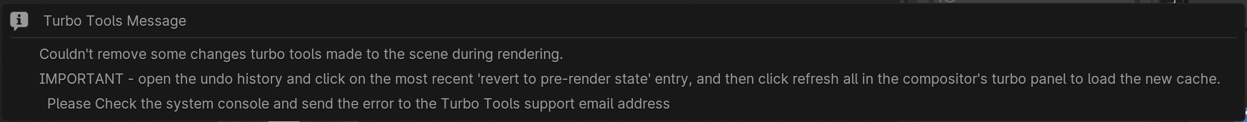 - IMPORTANT - Always render from the compositor, and if you notice the turbo denoising networks don't disappear after rendering completes, immediately choose 'revert to pre-render state' from the undo history, and then click 'refresh all' to load in the new cache. This will avoid any issues next time you render.