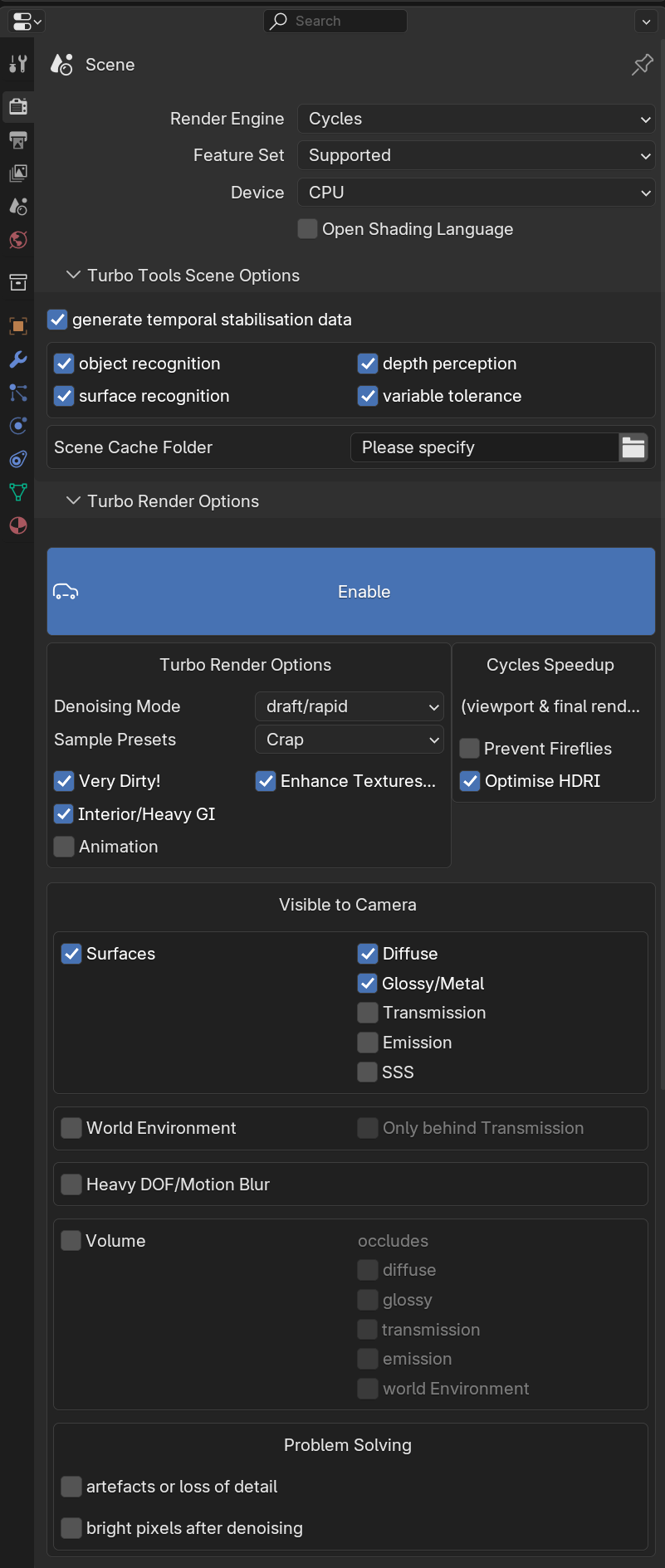 - specify a scene cache folder. This can be set in the Turbo Tools Scene options area, or in the compositor n panel's turbo tab. It needs to be set even if you have Turbo Render disabled, because Turbo Tools still needs to generate the cache in preparation for the post rendering features of the addon (even if you're using a different render engine). If you've placed multiple render layer nodes in the compositor in order to to render multiple scenes, then you'll need to go into each scene to set their cache folders too. You can use the same cache folder for all scenes, but it's recommended to only use one cache folder per blend file to avoid naming conflicts. The cache is automatically loaded when necessary (publishing, frame change, playback), and is chosen based on scene name and viewlayer name, so if you use the same cache folder for a completely different blend file that has the same scene names and viewlayer names, Turbo may load the wrong cache or overwrite the other blend files turbo cache.