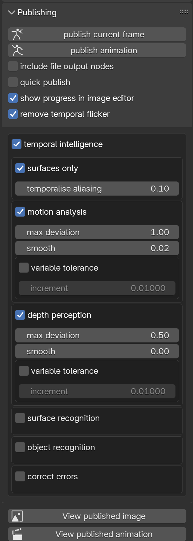 - Temporal Stabiliser - When enabled, it removes flicker from animations during publishing, that would otherwise require up to 40x longer render times to avoid.