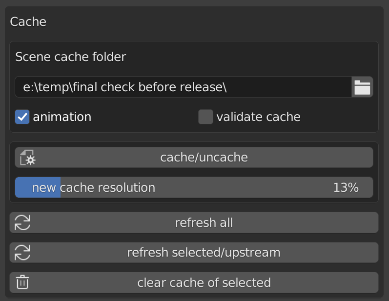 When enabled this will check that nodes downstream of the cache node still have the same parameter values, and if not will automatically recalculate the tree and update the cache files for just the necessary frames. This can be very slow, so only use it after adding a new cache node, or if you know the cache is out of date (for example if you've changed a property on a node which is downstream of the cache node). Only applicable when animation is enabled. No need to enable directly after rendering, as all the cache will have been created during rendering so it's guaranteed to be up to date at this point.
