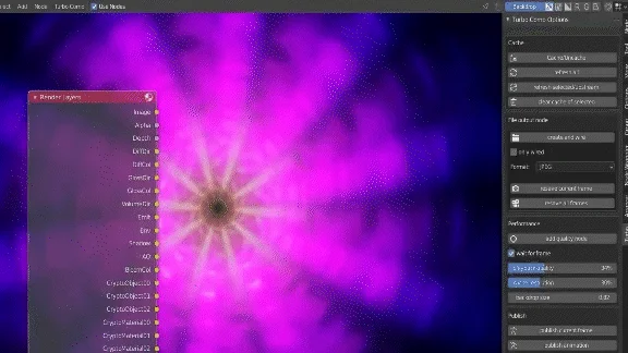 - Optionally go to the compositor to do post production work such as colour grading. Turbo Tools will automatically replace render layer nodes with the Turbo Cache after rendering completes, which means you can do things like keyframe node values during playback, whilst seeing the result directly in the image editor or compositor backdrop! There are also other time saving features of Turbo Tools X, which can be found in the compositor n panel's Turbo tab.