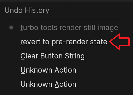 - click render. IMPORTANT - It's advisable to always render from the compositor workspace, because there's a known Blender bug that on very rare occasions, can prevent python working properly directly after a render job completes. In that case you'll notice the temporary node networks don't disappear automatically as they should, which can lead to incorrect results next time you render. To avoid having to manually remove the nodes later, all you need to do is click 'revert to pre-render state' from the undo history, and then click 'refresh all' in the compositor n panel's turbo tab to load in the new turbo cache (ready for any post production work such as publishing or flicker removal with the stabiliser)