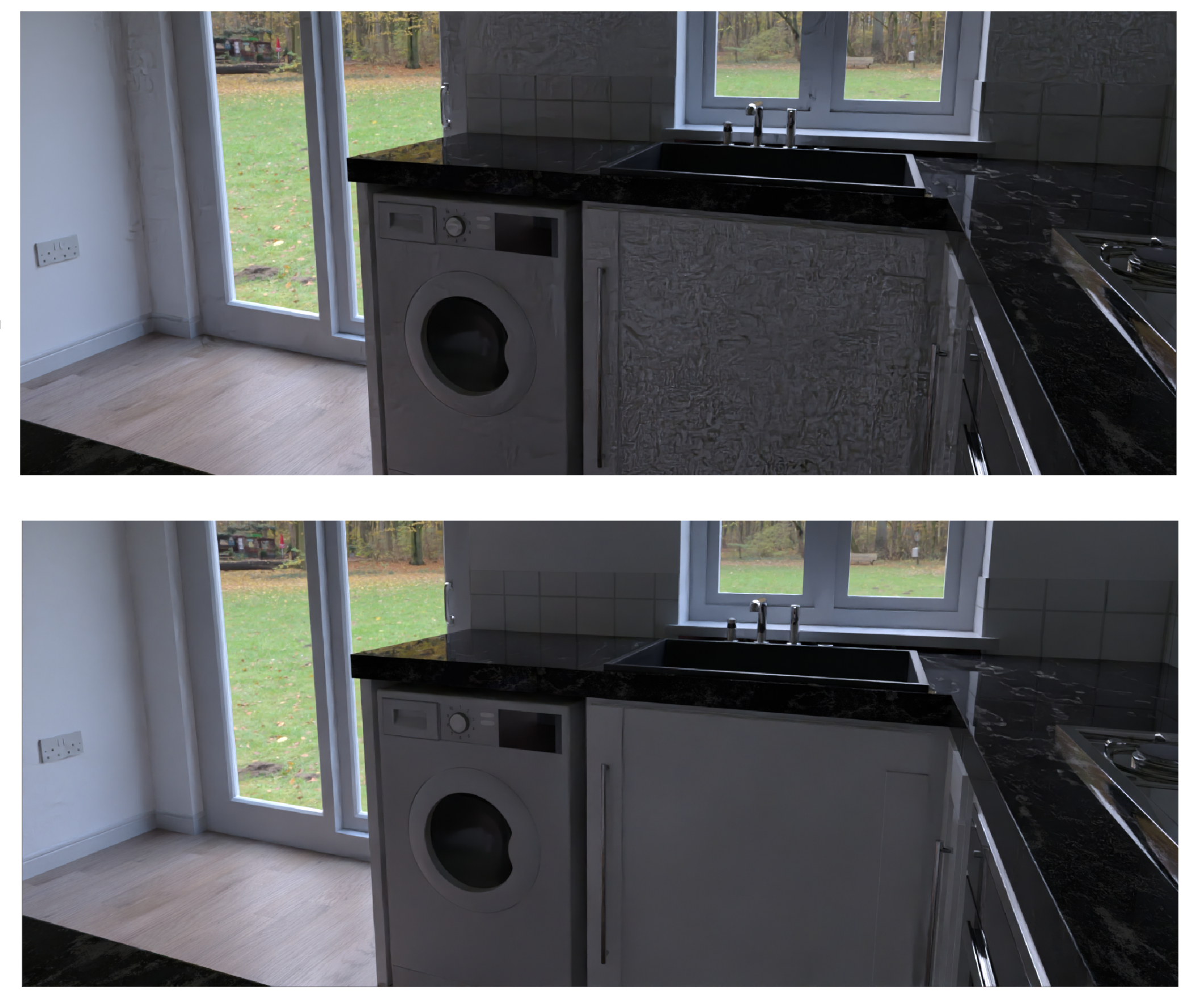 - High (clean image pass only) - The high mode will produce excellent lighting, shadows and reflections. This is suitable for final renders where the individually denoised passes aren't needed for compositing.